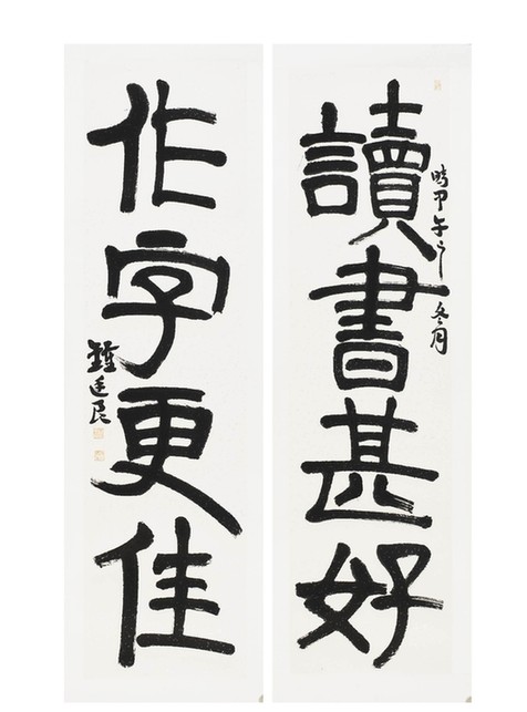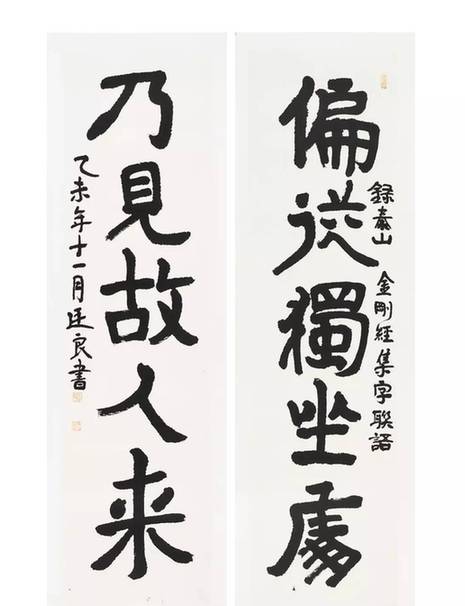 鐘廷良學(xué)書的過程離不開他的收藏,也得益于他的收藏!2011年收得清代書壇巨匠伊秉綬一副對聯(lián)后,細細研摩臨寫。此后,也有所悟所得。2012年收得民國舊拓“泰山金剛經(jīng)”集聯(lián)后,對泰山金剛經(jīng)刻石奉為至尊,敬若神明。爾后,凡作大字,皆以其為架構(gòu),而其書也漸有可觀者。由于長期從事文字工作之關(guān)系。讀書,亦成了鐘廷良生活的一部分。其深知唯有讀書方能為書法注入養(yǎng)分。唯有知識方能豐富書法內(nèi)涵。鐘廷良的書法,尊崇于中國傳統(tǒng)文化所倡導(dǎo)的書論和畫理。在學(xué)習(xí)古人、先賢經(jīng)典的基礎(chǔ)上,小心求索,認(rèn)真創(chuàng)作。既注重以古為師,又融匯時代精神,孜孜不倦,其書漸入佳境。