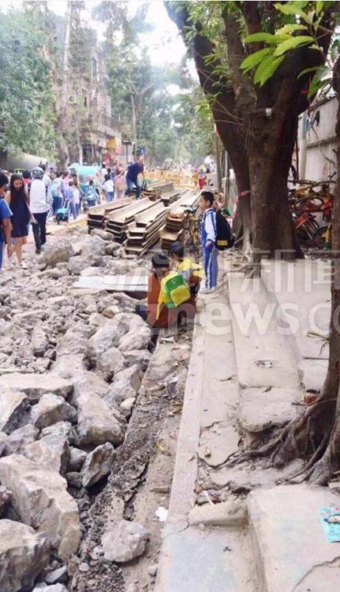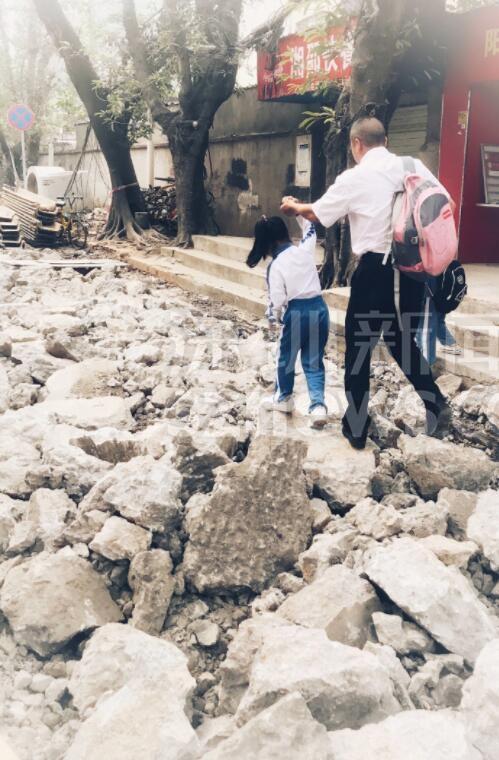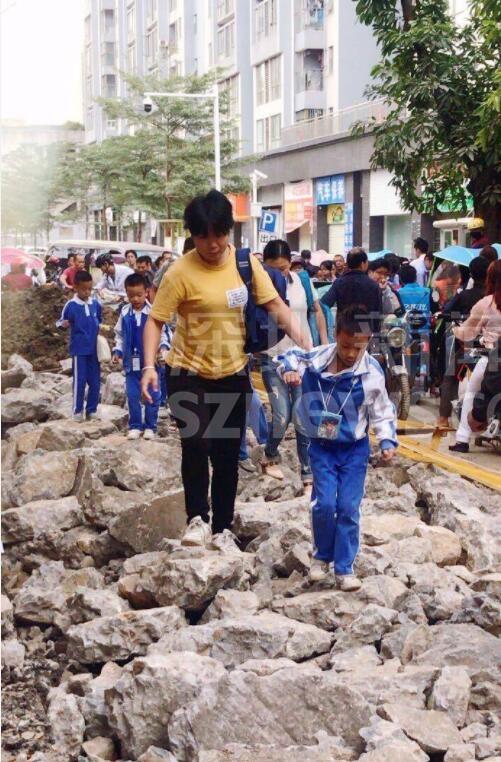 另有網友跟帖表示:同學們求學路坎坷,看得揪心!從現(xiàn)場圖可以看到,學生上下學都要穿過工地。路面被挖開,道路邊上只留下很窄的一條小道。上下學高峰期,成群結隊的學生在碎石穿行,旁邊小道上行人、三輪、電動單車堵成一鍋粥,存在很大的安全隱患。