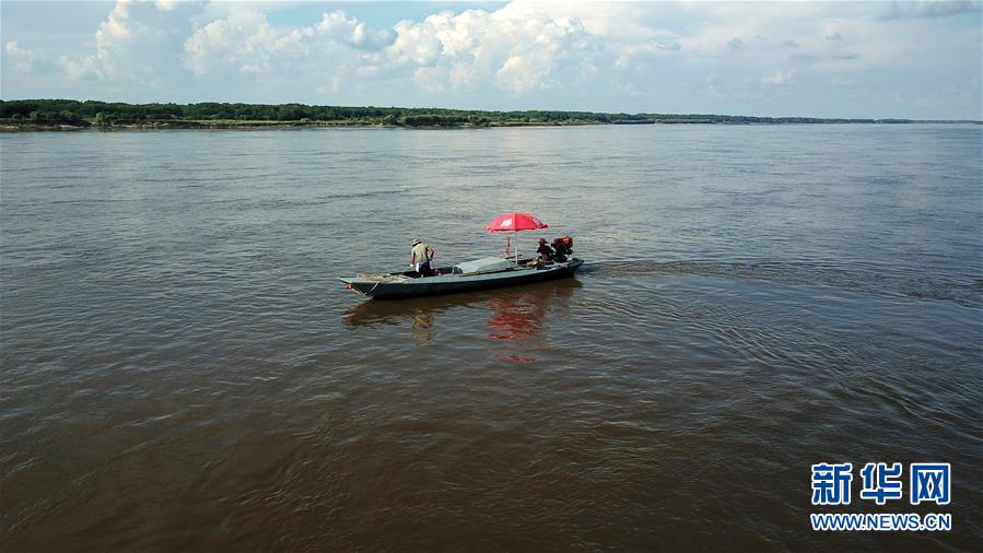 這是7月22日拍攝的在江中打魚(yú)的漁船(無(wú)人機(jī)照片)。新華社記者王建威攝