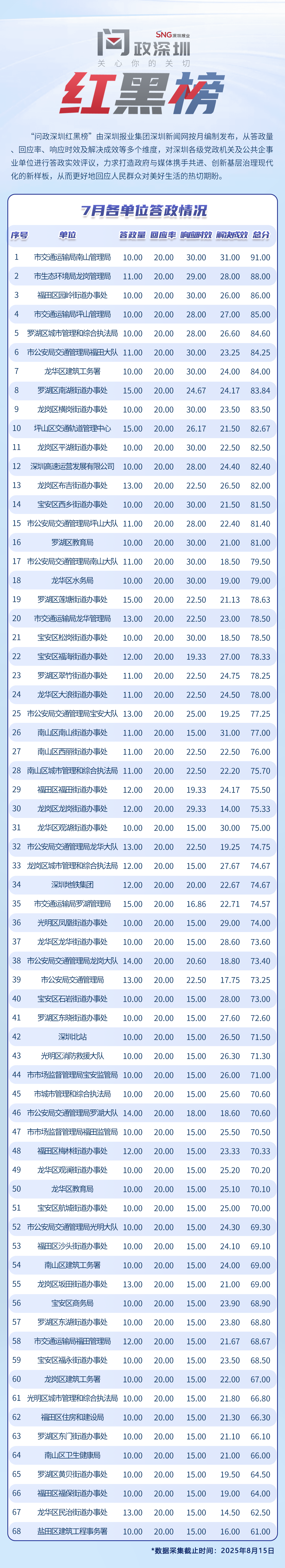 為探尋媒體如何精準(zhǔn)賦能基層治理現(xiàn)代化的“深圳路徑”,近日,深圳報業(yè)集團(tuán)正式掛牌成立“問政深圳”工作室,旨在進(jìn)一步推動網(wǎng)絡(luò)問政工作的高效開展。為確保相關(guān)工作更加契合實際需求,深圳報業(yè)集團(tuán)深圳新聞網(wǎng)按照“最快速度辦結(jié)”的總體要求,將原有月度榜單創(chuàng)新升級為“問政深圳紅黑榜”,并對評分體系進(jìn)行了細(xì)致優(yōu)化。該榜單從答政量、回應(yīng)率、響應(yīng)時效及解決成效等多個維度,對深圳各級黨政機(jī)關(guān)及公共企事業(yè)單位進(jìn)行答政實效評議,力求打造政府與媒體攜手共進(jìn)、創(chuàng)新基層治理現(xiàn)代化的新樣板,從而更好地回應(yīng)人民群眾對美好生活的熱切期盼。