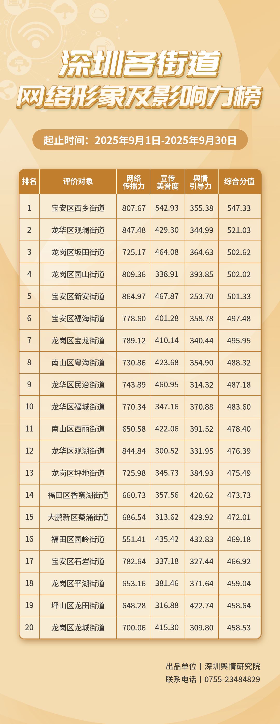為深入了解深圳市各街道的網絡形象構建狀況和社會影響,推動街道治理“提質增效”,增強城市高質量發(fā)展動能,深圳輿情研究院編制推出《深圳各街道網絡形象及影響力榜》。榜單具有獨立客觀的評價體系,通過數據采集和分析,評估各街道的網絡傳播力、宣傳美譽度及輿情引導力,并對全市11個區(qū)共78個街道的網絡形象及影響力進行綜合排名。