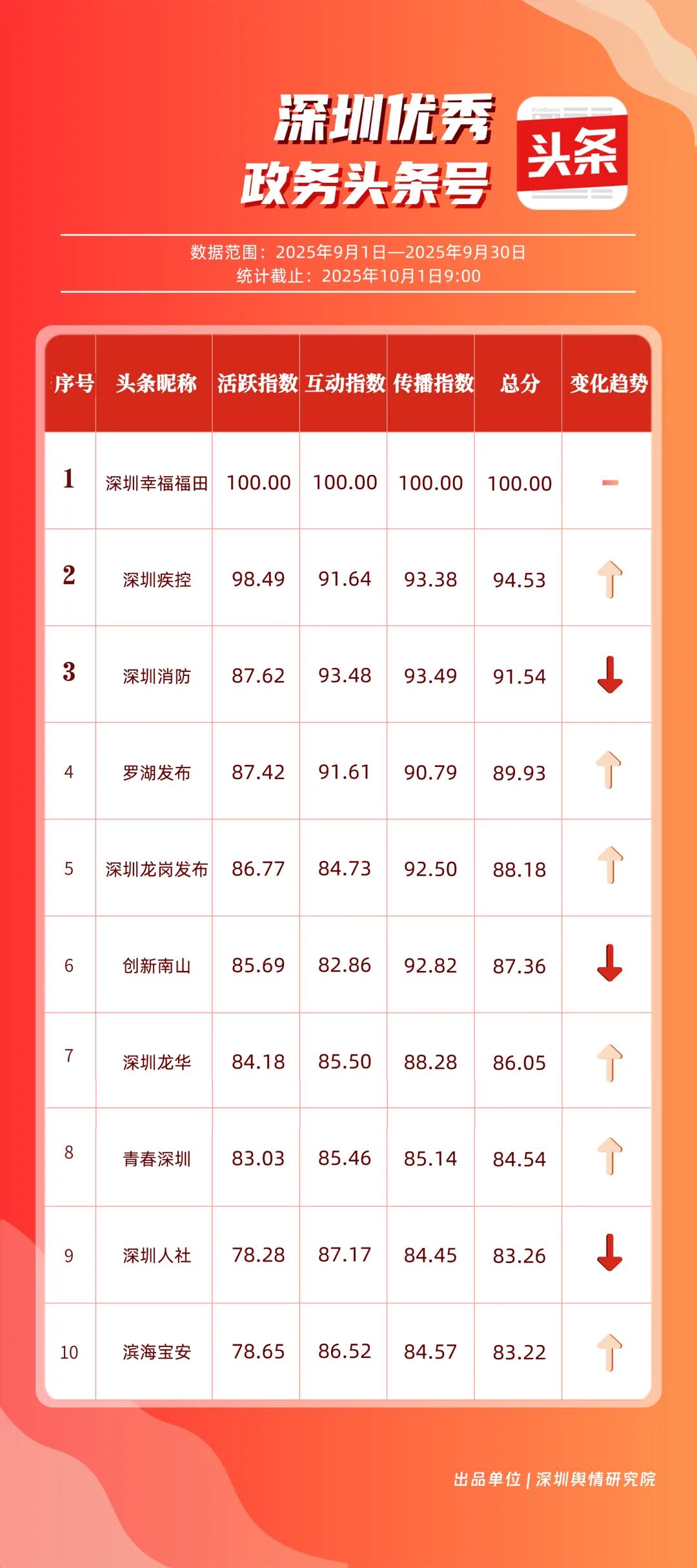 9月,“深圳衛(wèi)健委”“深圳龍崗發(fā)布”“幸福福田”“i深圳”“青春深圳”“深圳工會(huì)”“深圳教育”“深圳交通”“創(chuàng)新南山”“深圳應(yīng)急管理”等30個(gè)政務(wù)微信公眾號(hào)榮登“深圳優(yōu)秀政務(wù)微信公眾號(hào)”榜單。9月,“深圳衛(wèi)健委”以總分100.00的成績(jī)蟬聯(lián)榜單首位,其憑借突破常規(guī)視角的選題,解讀專業(yè)健康知識(shí),引發(fā)大量網(wǎng)民共鳴,內(nèi)容質(zhì)量與傳播力形成雙向賦能;“深圳龍崗發(fā)布”以總分93.24位居第二,聚焦區(qū)域民生服務(wù)升級(jí)等動(dòng)態(tài),信息觸達(dá)率不斷提升;“幸福福田”圍繞商圈經(jīng)濟(jì)復(fù)蘇、文化節(jié)慶活動(dòng)等主題開展系列宣傳,增強(qiáng)區(qū)域活力展示,位列第三;“i深圳”“青春深圳”“深圳工會(huì)”等也持續(xù)優(yōu)化賬號(hào)內(nèi)容,通過實(shí)用信息推送強(qiáng)化政務(wù)服務(wù)定位。