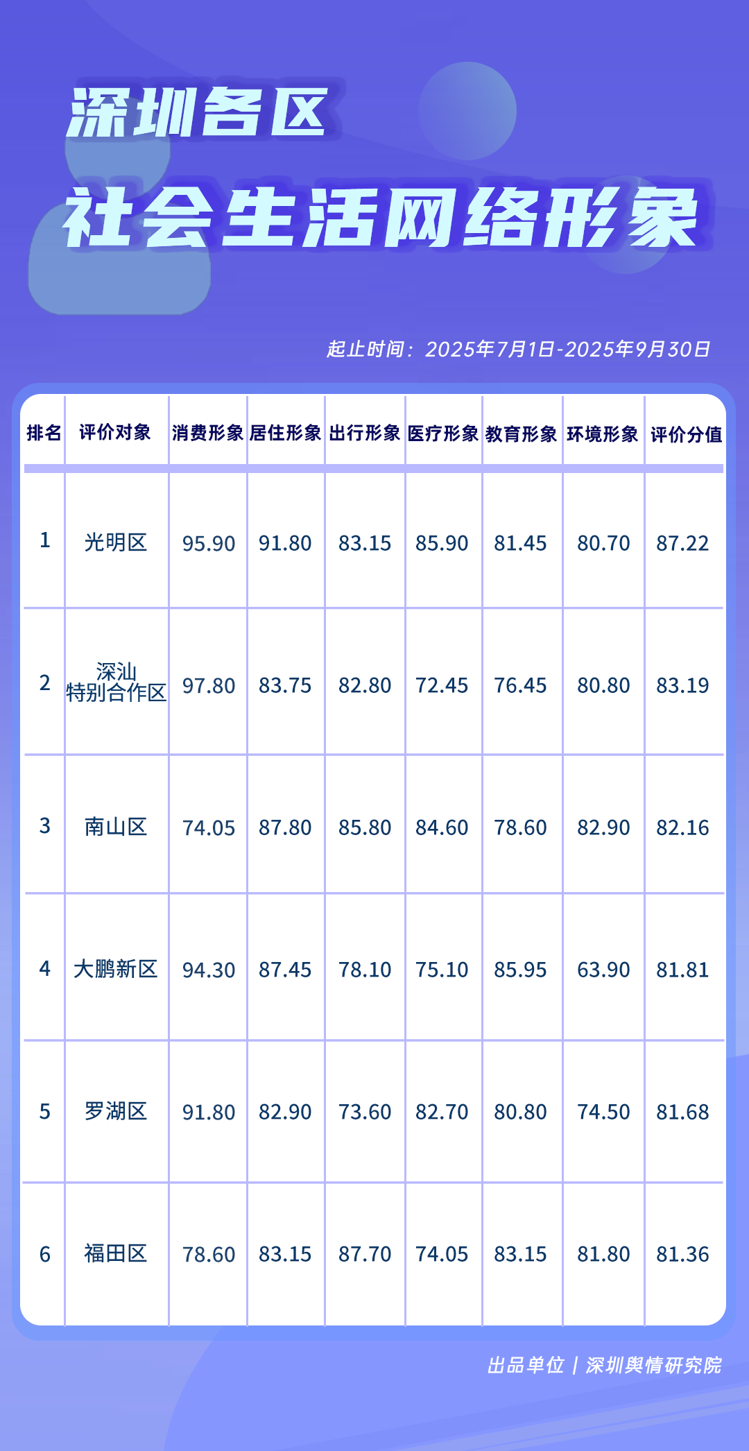 7-9月,各區(qū)各單位網(wǎng)絡(luò)形象建設(shè)成效如何?《深圳各區(qū)各單位網(wǎng)絡(luò)形象建設(shè)榜》帶您了解。本期榜單數(shù)據(jù)統(tǒng)計(jì)時間范圍為2025年7月1日至9月30日。